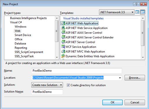 So the starting point is to get an ASP.Net page that can test out the functionality we are after and report success or failure. This is simple enough, fire up Visual Studio (I’m using 2008 SP1) and create a new ASP.Net Application (File -> New -> Project -> Web -> ASP.Net Web Application), I’m calling mine “PostBackDemo”