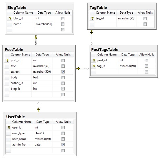 - There is no class corresponding to the PostTagsTable, just collection properties on the Post and Tag classes to represent the relationship