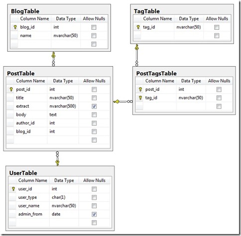 Let’s start by looking at the schema we are going to map to, I’ve intentionally used table/column naming that makes it clear what is happening when we start mapping in code… I’m definitely not implying it’s good database design to post-fix table names with “Table” ![]()