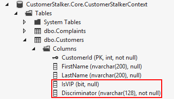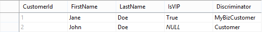 By default Code First uses the TPH pattern to store an inheritance hierarchy, hence the new Discriminator column in the Customers table. This allows Entity Framework to differentiate between Customers and MyBizCustomers. Later in this post we’ll take a look at how to introduce a derived type without modifying the existing table.