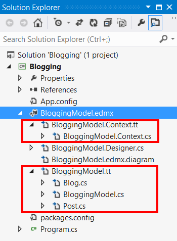 When you create a new model using VS2012 or later you get two T4 templates (.tt files) nested under you EDMX file – one to generate the context and another to generate the entity classes. If you have opted in to T4 based code generation in VS2010 then you’ll have the same setup but the T4 templates won’t be nested under the EDMX. Expanding the T4 template will show the files that is is generating.